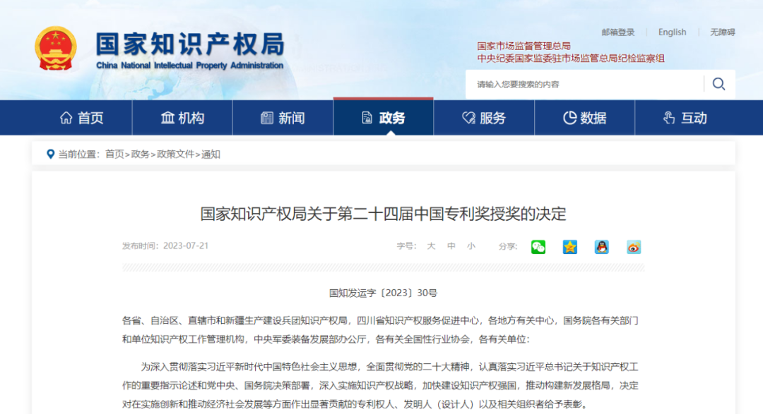 中国专利奖由国家知识产权局和世界知识产权组织共同主办,是我国唯一专门对授予专利权的发明创造给予奖励的政府部门奖。该奖项采用项目推荐方式,以高质量发展为导向,优先推荐基础研究、应用基础研究、突破“卡脖子”技术难题等方面形成的核心专利。