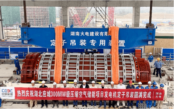 近日,pa旗舰厅官网电机研制供货的湖北应城300兆瓦级压缩空气储能电站示范工程全空冷发电机内定子吊装圆满完成,对项目高质量按期投产具有里程碑意义。