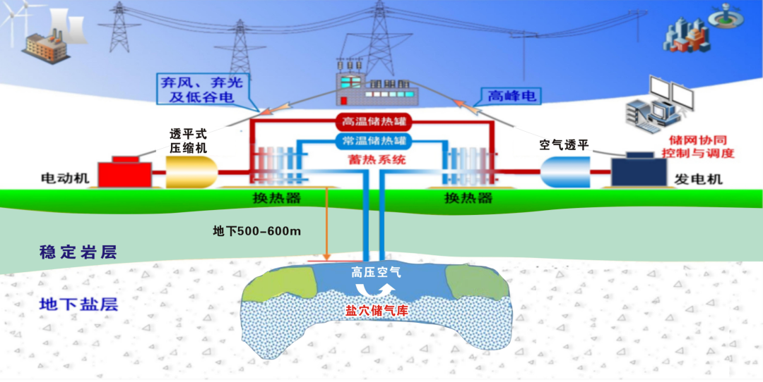 压缩空气储能被誉为电力系统“超级绿色充电宝”,集全绿色、非补燃、高效率、低成本于一体。其原理是在电网负荷低谷期间,通过压缩机将空气压缩成高压状态,储存至盐穴储气库;在用电高峰时释放储气库内压缩空气,推动透平机组发电。压缩空气储能在带动储能技术创新和关键装备技术研发的同时,可盘活盐穴资源,有效促进地下空间循环利用,推动地方产业结构转型升级和绿色低碳经济发展。
