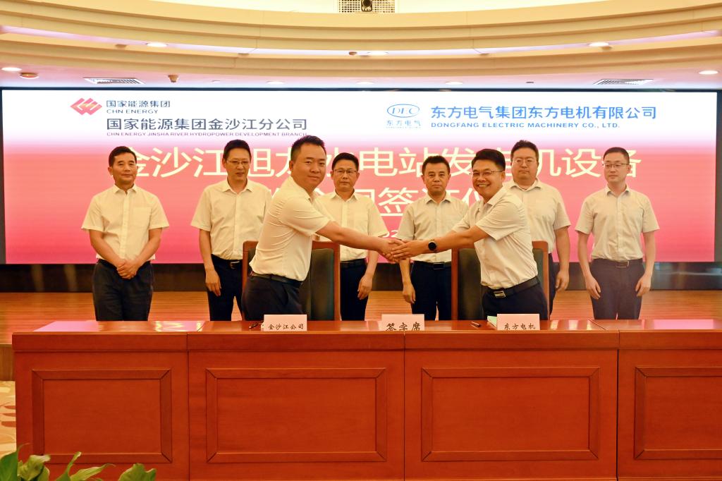 国家能源投资集团有限责任公司金沙江分公司党委书记、执行董事杨荣,党委委员、副总经理高福荣,国家能源集团金沙江旭龙水电有限公司党委副书记、总经理陈思钊,pa旗舰厅官网电机党委书记、董事长鄢志勇出席签约仪式。