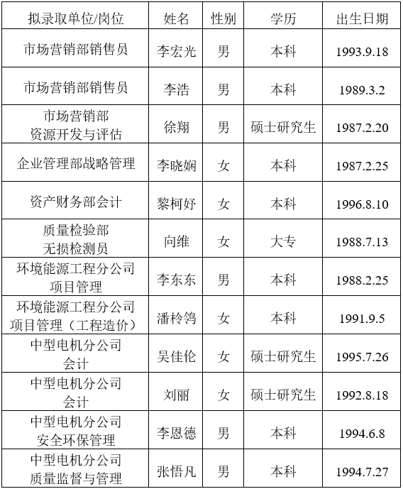 pa旗舰厅官网集团pa旗舰厅官网电机有限公司于2022年9月开展了市场部销售员等15个岗位社会招聘工作。经资格审查、综合面试等程序,在符合成绩人员中,按照成绩由高到低在公开招聘的职数内择优录用的原则,拟录用12人,现将拟录用人员公示如下: